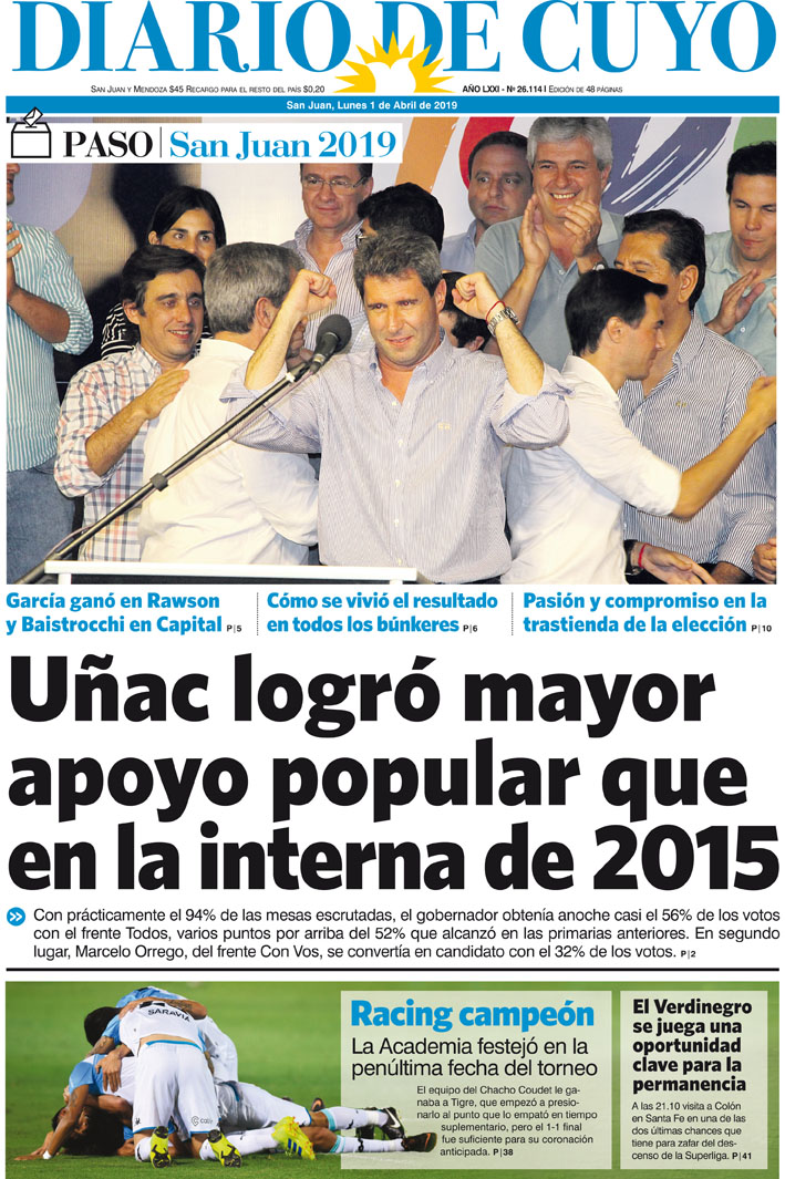 Diario de Cuyo | HOME | Noticias | Tapa Edición Tapa Edición 1 de Abril 2019 Por Redacción Diario de Cuyo 01/04/2019 · 0:00 Escuchar la noticia Escuchar la noticia Your browser doesn’t support HTML5 audio Tapa Edición Ver los comentarios ›