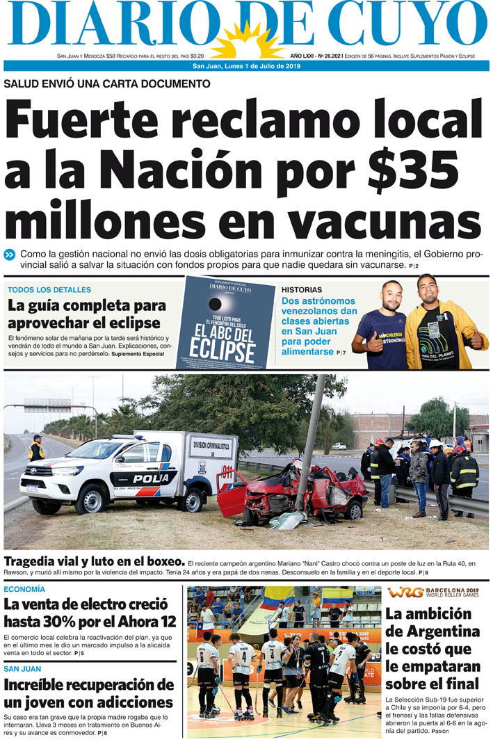 Diario de Cuyo | HOME | Noticias | Tapa Edición Tapa Edición 1 de Julio de 2019 Por Redacción Diario de Cuyo 30/06/2019 · 0:00 Escuchar la noticia Escuchar la noticia Your browser doesn’t support HTML5 audio Tapa Edición Ver los comentarios ›