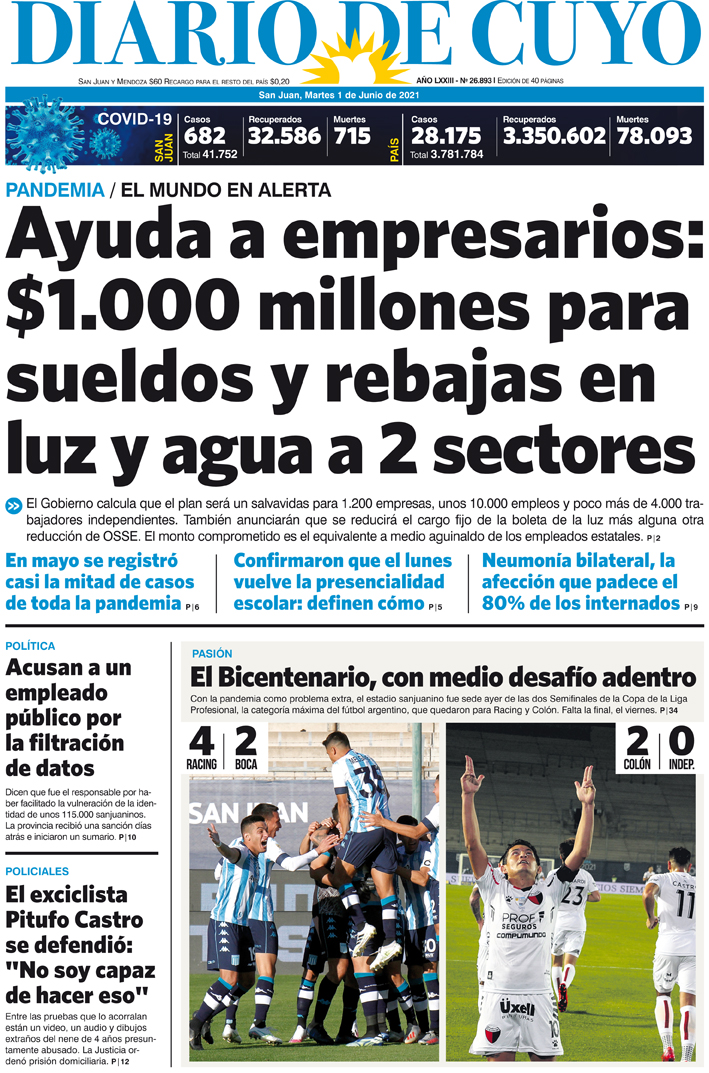 Diario de Cuyo | HOME | Noticias Tapa Edición 1 de Junio de 2021 Por Redacción Diario de Cuyo 31/05/2021 · 0:00 Escuchar la noticia Escuchar la noticia Your browser doesn’t support HTML5 audio Ver los comentarios ›