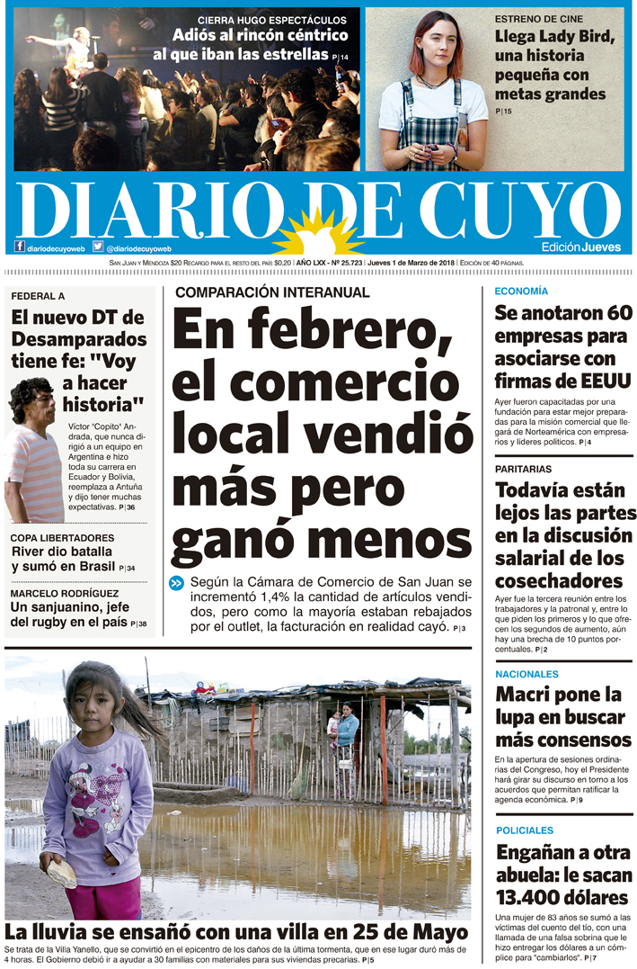 Diario de Cuyo | HOME | Noticias | Tapa Edición Tapa Edición 1 de Marzo del 2018 Por Redacción Diario de Cuyo 01/03/2018 · 0:00 Escuchar la noticia Escuchar la noticia Your browser doesn’t support HTML5 audio Tapa Edición Ver los comentarios ›
