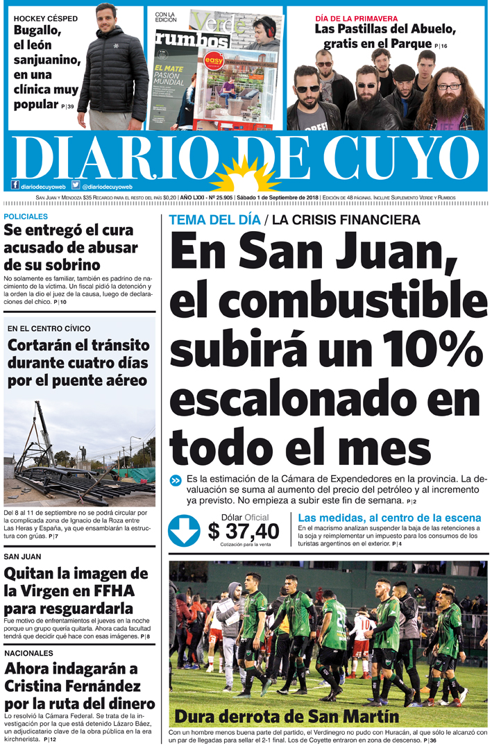 Diario de Cuyo | HOME | Noticias | Tapa Edición Tapa Edición 1 de Septiembre 2018 Por Redacción Diario de Cuyo 31/08/2018 · 0:00 Escuchar la noticia Escuchar la noticia Your browser doesn’t support HTML5 audio Tapa Edición Ver los comentarios ›