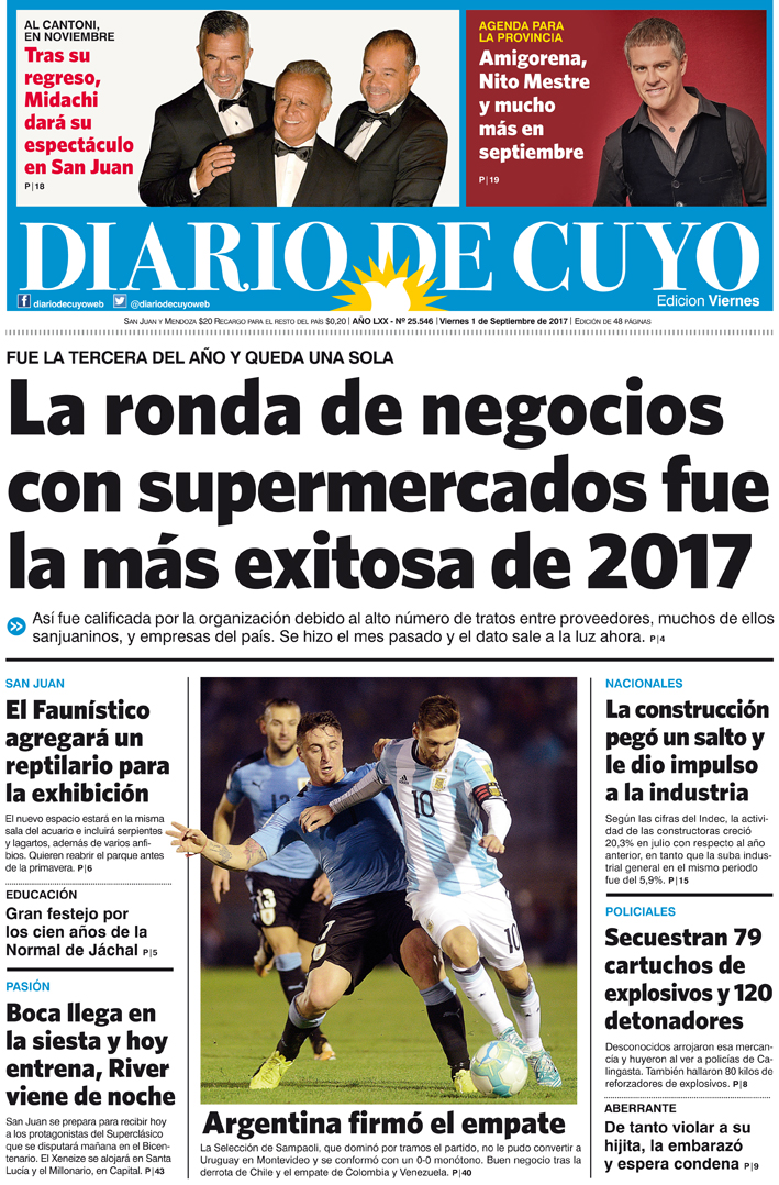 Diario de Cuyo | HOME | Noticias Tapa Edición 1 de Septiembre del 2017 Por Redacción Diario de Cuyo 01/09/2017 · 0:00 Escuchar la noticia Escuchar la noticia Your browser doesn’t support HTML5 audio Ver los comentarios ›