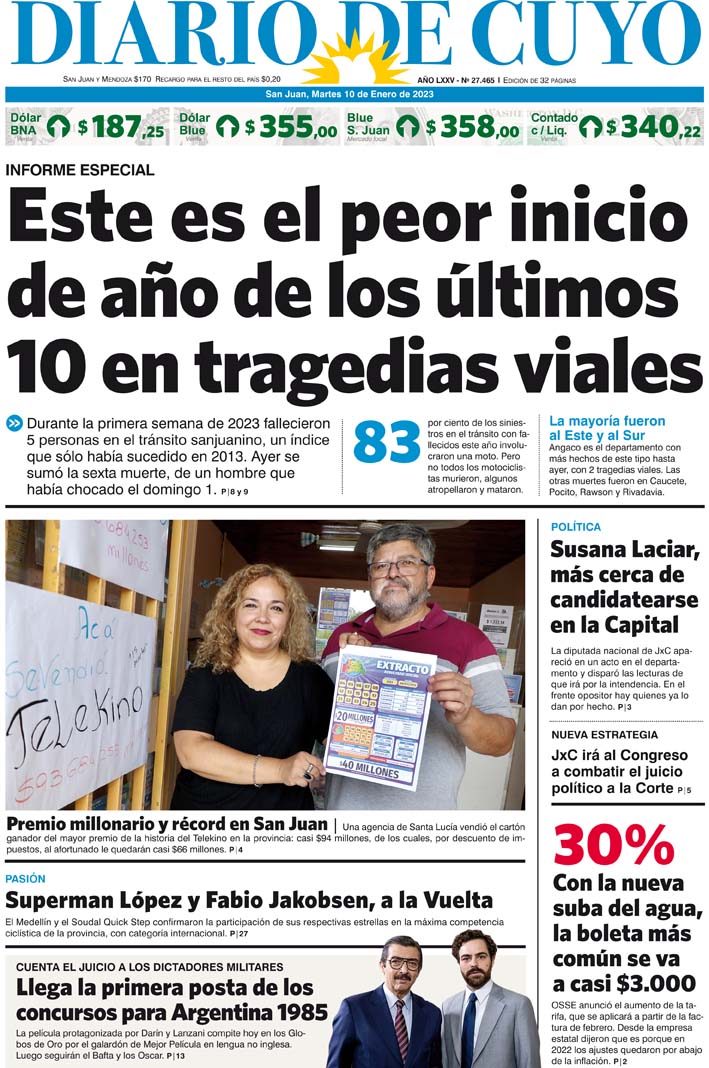 Diario de Cuyo | HOME | Noticias Tapa Edición 10 de Enero de 2023 Por Redacción Diario de Cuyo 09/01/2023 · 0:00 Escuchar la noticia Escuchar la noticia Your browser doesn’t support HTML5 audio Ver los comentarios ›