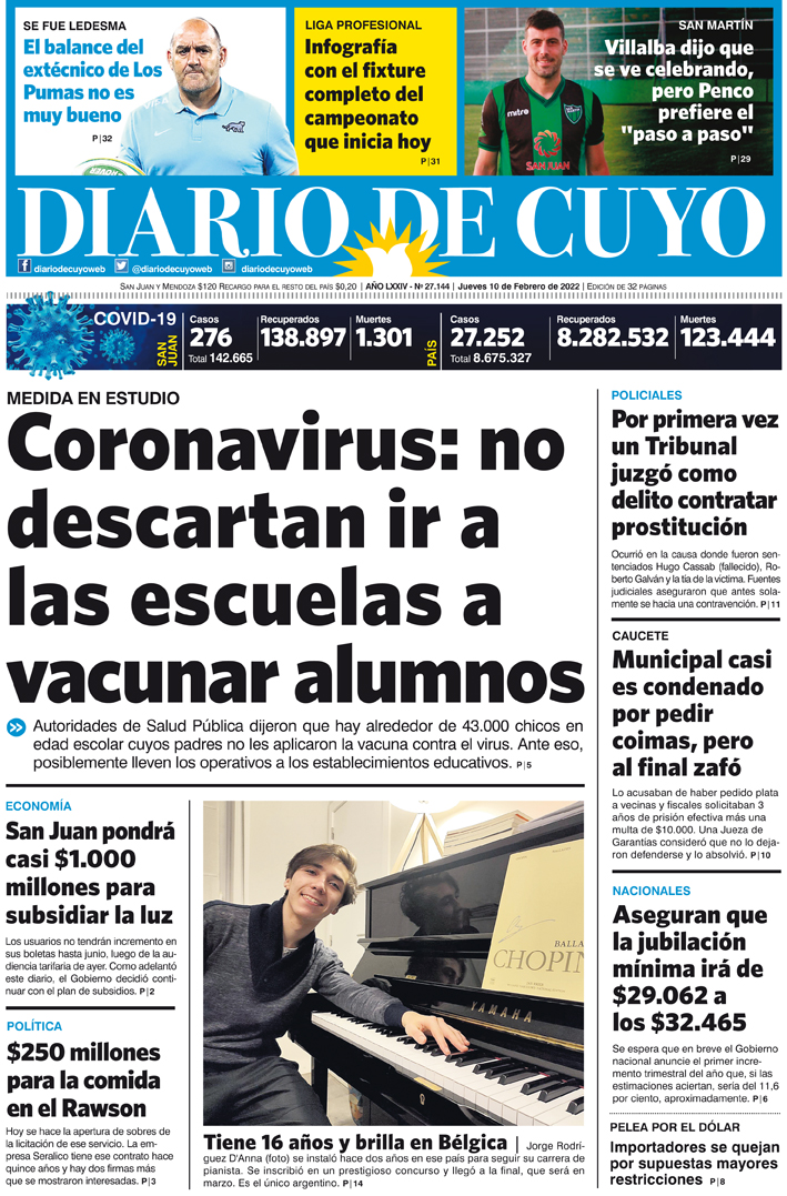 Diario de Cuyo | HOME | Noticias Tapa Edición 10 de Febrero del 2022 Por Redacción Diario de Cuyo 10/02/2022 · 0:00 Escuchar la noticia Escuchar la noticia Your browser doesn’t support HTML5 audio Ver los comentarios ›