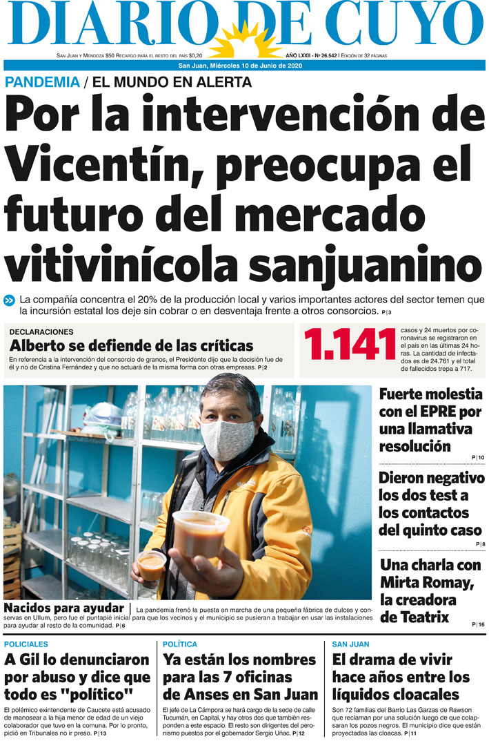 Diario de Cuyo | HOME | Noticias Tapa Edición 10 de Junio del 2020 Por Redacción Diario de Cuyo 09/06/2020 · 0:00 Escuchar la noticia Escuchar la noticia Your browser doesn’t support HTML5 audio Ver los comentarios ›