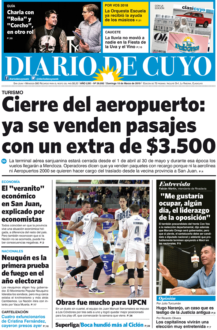 Diario de Cuyo | HOME | Noticias | Tapa Edición Tapa Edición 10 de Marzo 2019 Por Redacción Diario de Cuyo 09/03/2019 · 0:00 Escuchar la noticia Escuchar la noticia Your browser doesn’t support HTML5 audio Tapa Edición Ver los comentarios ›