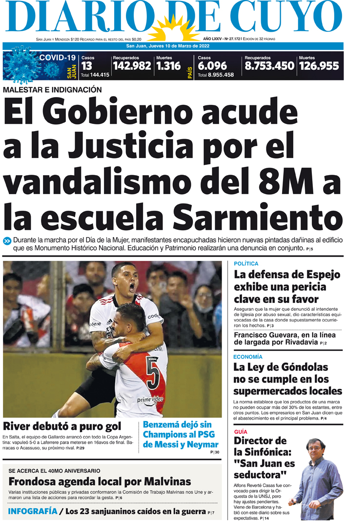 Diario de Cuyo | HOME | Noticias Tapa Edición 10 de Marzo del 2022 Por Redacción Diario de Cuyo 10/03/2022 · 0:00 Escuchar la noticia Escuchar la noticia Your browser doesn’t support HTML5 audio Ver los comentarios ›