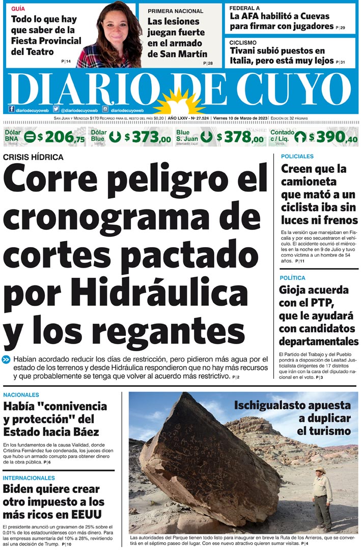 Diario de Cuyo | HOME | Noticias Tapa Edición 10 de Marzo del 2023 Por Redacción Diario de Cuyo 09/03/2023 · 0:00 Escuchar la noticia Escuchar la noticia Your browser doesn’t support HTML5 audio Ver los comentarios ›