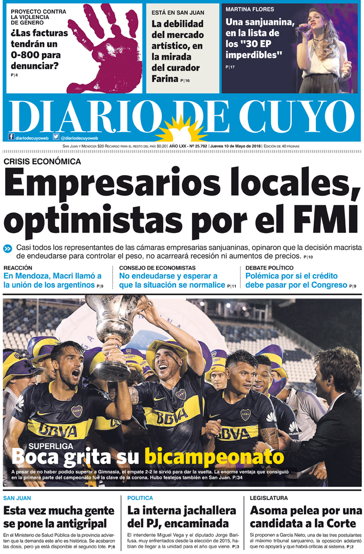 Diario de Cuyo | HOME | Noticias | Tapa Edición Tapa Edición 10 de Mayo de 2018 Por Redacción Diario de Cuyo 10/05/2018 · 0:00 Escuchar la noticia Escuchar la noticia Your browser doesn’t support HTML5 audio Tapa Edición Ver los comentarios ›