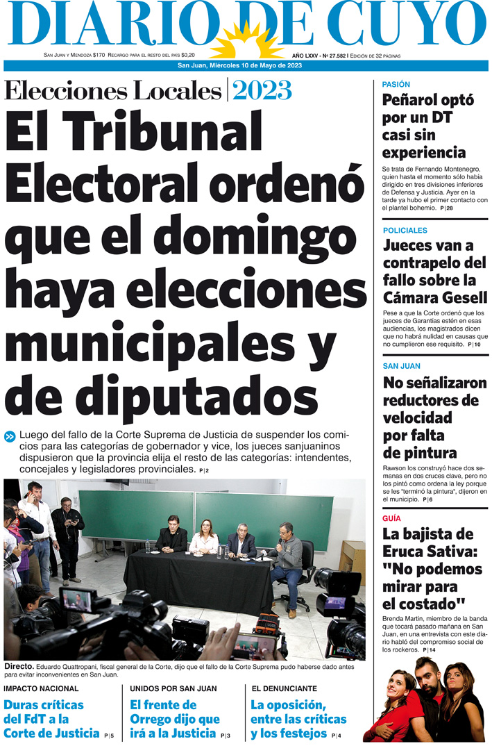 Diario de Cuyo | HOME | Noticias Tapa Edición 10 de Mayo del 2023 Por Redacción Diario de Cuyo 09/05/2023 · 0:00 Escuchar la noticia Escuchar la noticia Your browser doesn’t support HTML5 audio Ver los comentarios ›