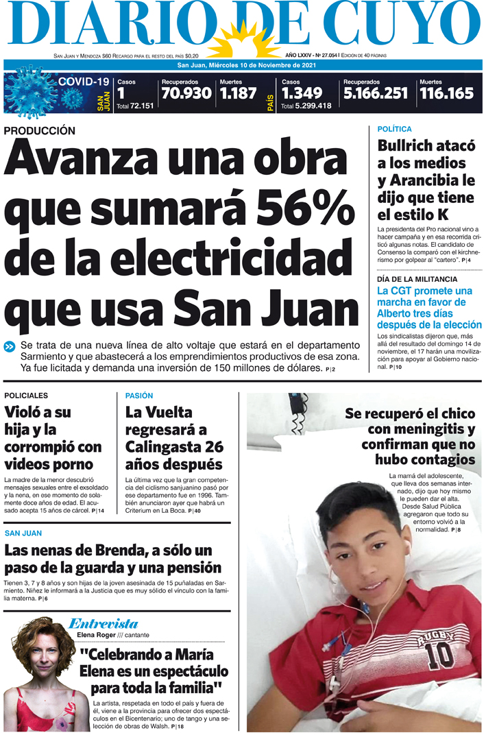 Diario de Cuyo | HOME | Noticias Tapa Edición 10 de Noviembre del 2021 Por Redacción Diario de Cuyo 09/11/2021 · 0:00 Escuchar la noticia Escuchar la noticia Your browser doesn’t support HTML5 audio Ver los comentarios ›