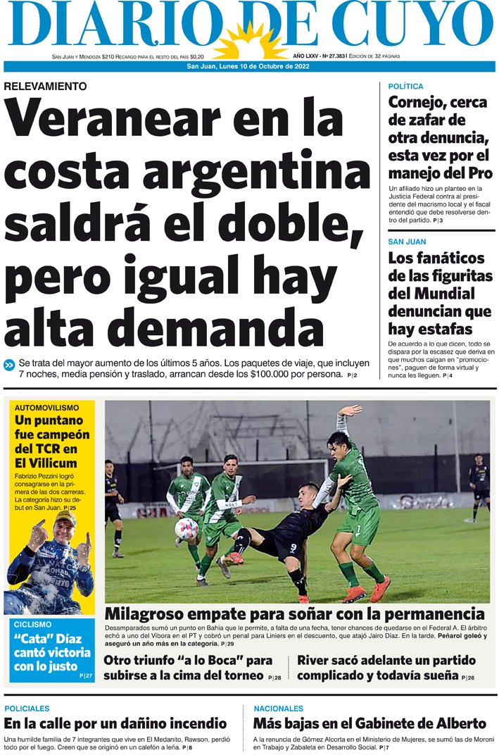 Diario de Cuyo | HOME | Noticias Tapa Edición 10 de Octubre del 2022 Por Redacción Diario de Cuyo 09/10/2022 · 0:00 Escuchar la noticia Escuchar la noticia Your browser doesn’t support HTML5 audio Ver los comentarios ›