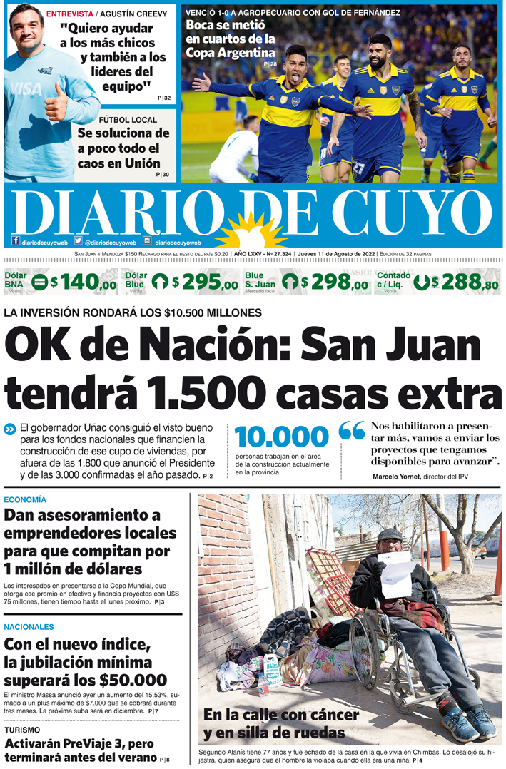 Diario de Cuyo | HOME | Noticias Tapa Edición 11 de Agosto del 2022 Por Redacción Diario de Cuyo 11/08/2022 · 0:00 Escuchar la noticia Escuchar la noticia Your browser doesn’t support HTML5 audio Ver los comentarios ›
