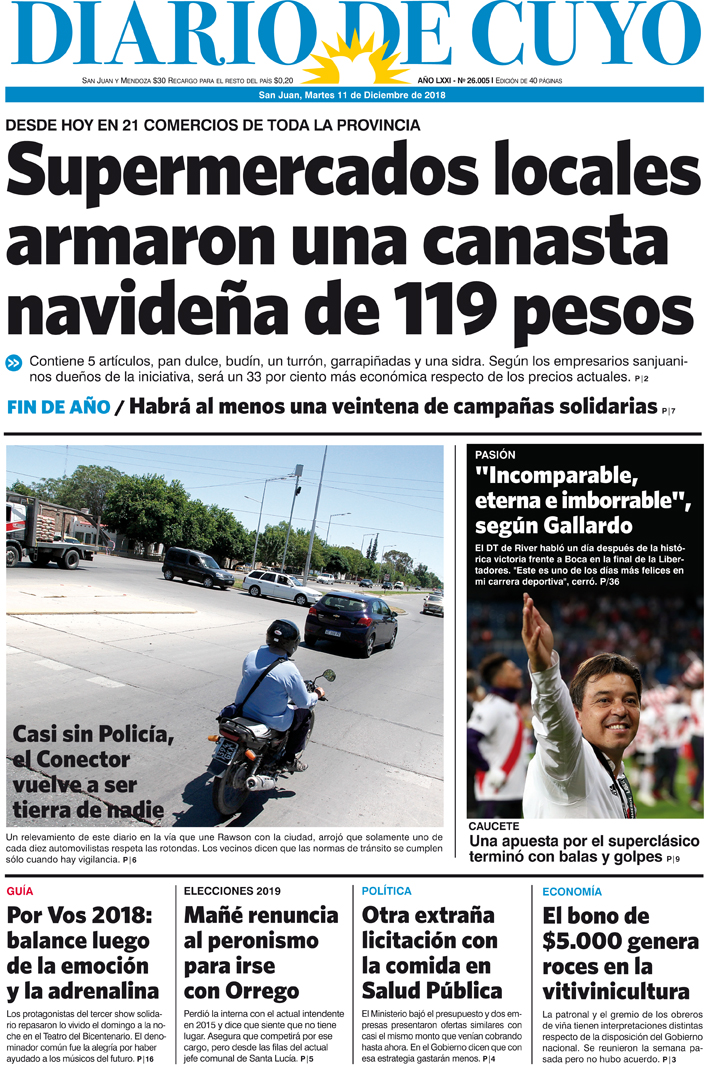 Diario de Cuyo | HOME | Noticias | Tapa Edición Tapa Edición 11 de Diciembre 2018 Por Redacción Diario de Cuyo 11/12/2018 · 0:00 Escuchar la noticia Escuchar la noticia Your browser doesn’t support HTML5 audio Tapa Edición Ver los comentarios ›
