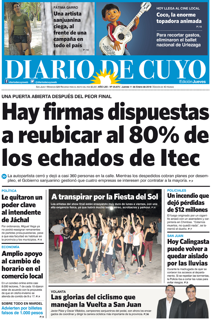 Diario de Cuyo | HOME | Noticias | Tapa Edición Tapa Edición 11 de Enero 2018 Por Redacción Diario de Cuyo 10/01/2018 · 0:00 Escuchar la noticia Escuchar la noticia Your browser doesn’t support HTML5 audio Tapa Edición Ver los comentarios ›