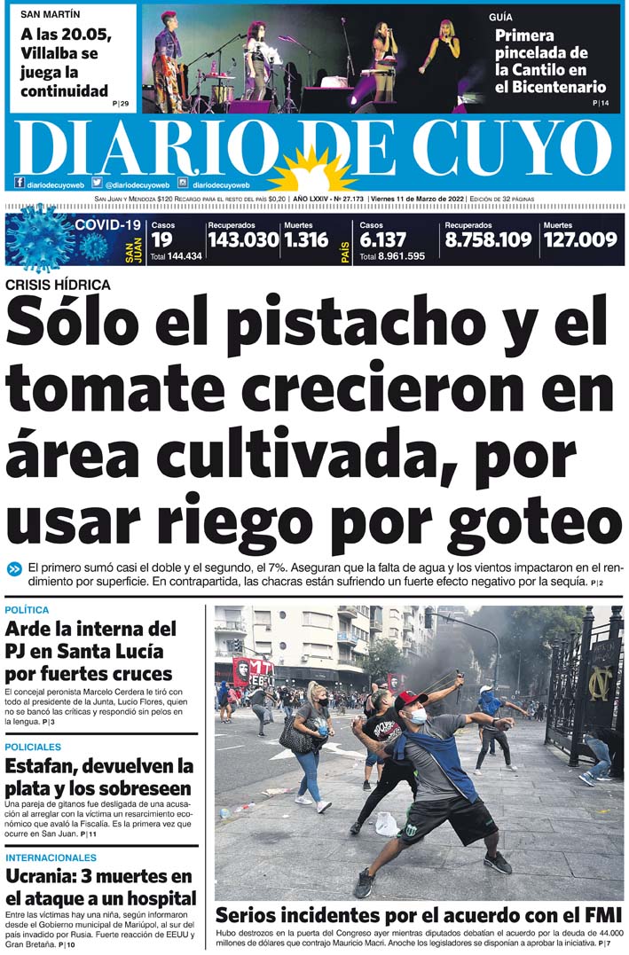 Diario de Cuyo | HOME | Noticias Tapa Edición 11 de Marzo de 2022 Por Redacción Diario de Cuyo 10/03/2022 · 0:00 Escuchar la noticia Escuchar la noticia Your browser doesn’t support HTML5 audio Ver los comentarios ›