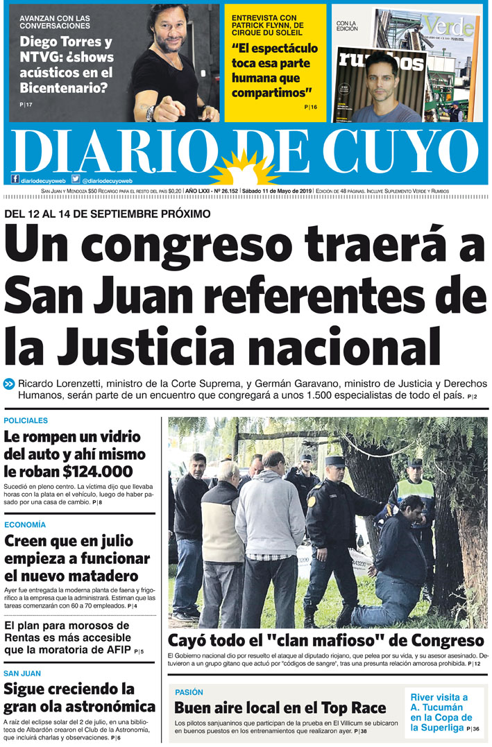 Diario de Cuyo | HOME | Noticias | Tapa Edición Tapa Edición 11 de Mayo 2019 Por Redacción Diario de Cuyo 10/05/2019 · 0:00 Escuchar la noticia Escuchar la noticia Your browser doesn’t support HTML5 audio Tapa Edición Ver los comentarios ›