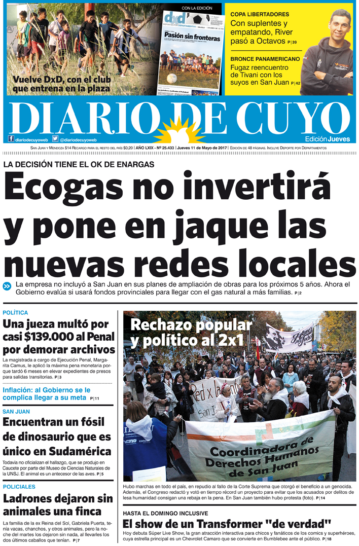 Diario de Cuyo | HOME | Noticias Tapa Edición 11 de Mayo del 2017 Por Redacción Diario de Cuyo 10/05/2017 · 0:00 Escuchar la noticia Escuchar la noticia Your browser doesn’t support HTML5 audio Ver los comentarios ›