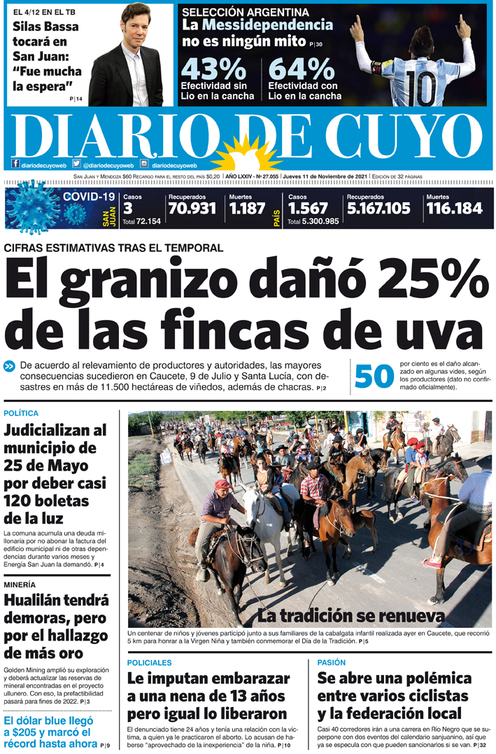 Diario de Cuyo | HOME | Noticias Tapa Edición 11 de Noviembre del 2021 Por Redacción Diario de Cuyo 10/11/2021 · 0:00 Escuchar la noticia Escuchar la noticia Your browser doesn’t support HTML5 audio Ver los comentarios ›