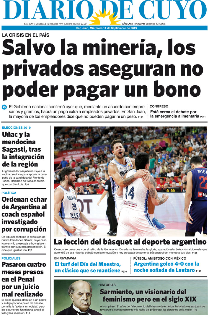 Diario de Cuyo | HOME | Noticias | Tapa Edición Tapa Edición 11 de Septiembre 2019 Por Redacción Diario de Cuyo 11/09/2019 · 0:00 Escuchar la noticia Escuchar la noticia Your browser doesn’t support HTML5 audio Tapa Edición Ver los comentarios ›