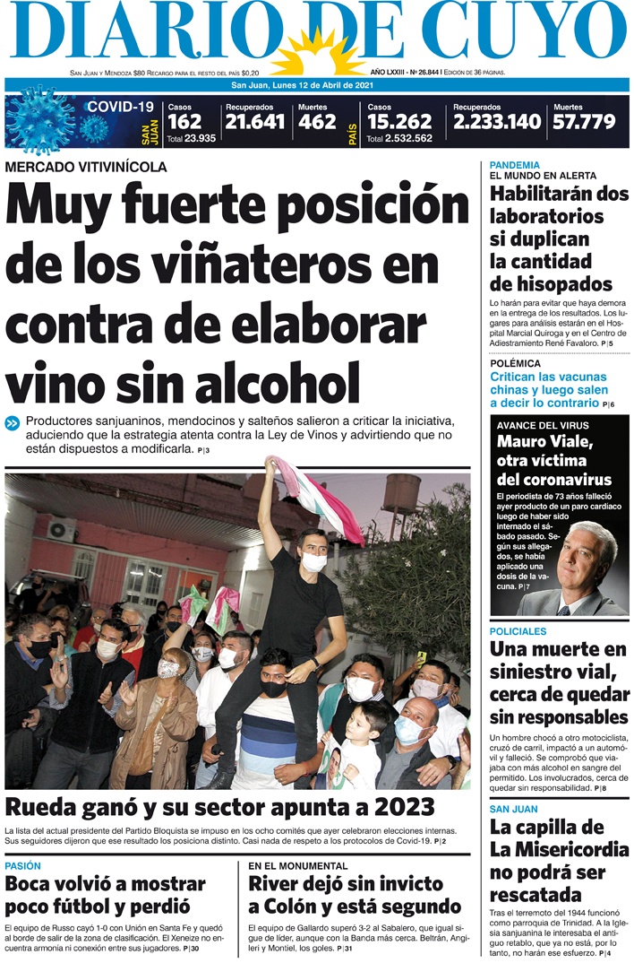 Diario de Cuyo | HOME | Noticias Tapa Edición 12 de Abril del 2021 Por Redacción Diario de Cuyo 11/04/2021 · 0:00 Escuchar la noticia Escuchar la noticia Your browser doesn’t support HTML5 audio Ver los comentarios ›