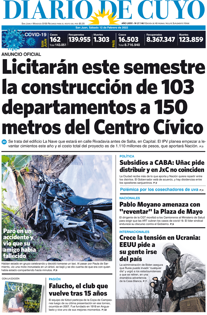 Diario de Cuyo | HOME | Noticias Tapa Edición 12 de Febrero del 2022 Por Redacción Diario de Cuyo 11/02/2022 · 0:00 Escuchar la noticia Escuchar la noticia Your browser doesn’t support HTML5 audio Ver los comentarios ›