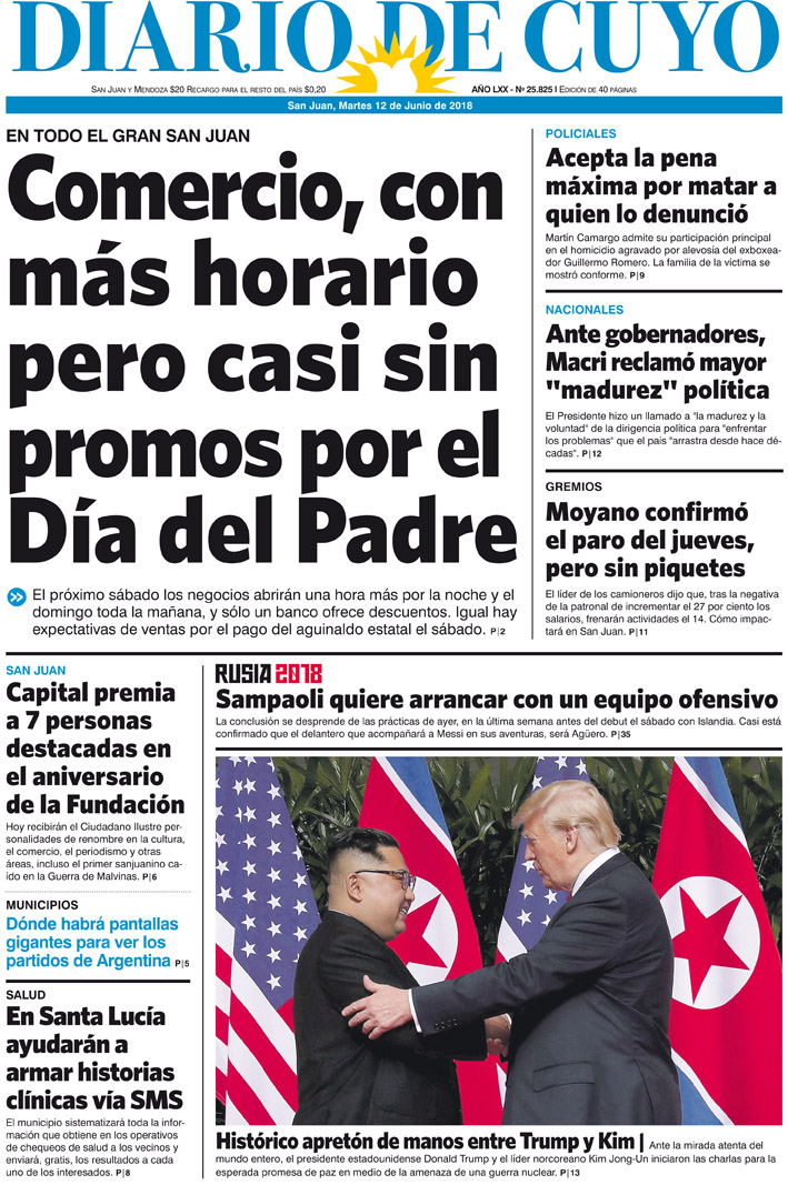 Diario de Cuyo | HOME | Noticias | Tapa Edición Tapa Edición 12 de Junio 2018 Por Redacción Diario de Cuyo 11/06/2018 · 0:00 Escuchar la noticia Escuchar la noticia Your browser doesn’t support HTML5 audio Tapa Edición Ver los comentarios ›