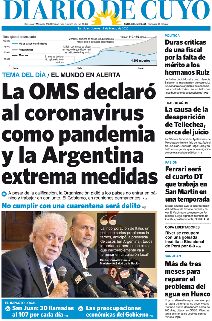 Diario de Cuyo | HOME | Noticias | Tapa Edición Tapa Edición 12 de Marzo de 2020 Por Redacción Diario de Cuyo 11/03/2020 · 0:00 Escuchar la noticia Escuchar la noticia Your browser doesn’t support HTML5 audio Tapa Edición Ver los comentarios ›