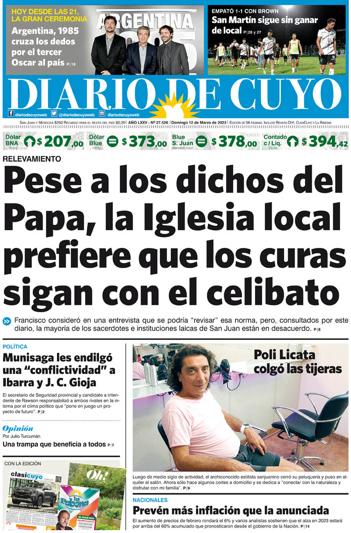 Diario de Cuyo | HOME | Noticias Tapa Edición 12 de Marzo de 2023 Por Redacción Diario de Cuyo 11/03/2023 · 0:00 Escuchar la noticia Escuchar la noticia Your browser doesn’t support HTML5 audio Ver los comentarios ›