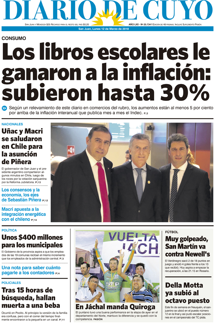 Diario de Cuyo | HOME | Noticias | Tapa Edición Tapa Edición 12 de Marzo del 2018 Por Redacción Diario de Cuyo 11/03/2018 · 0:00 Escuchar la noticia Escuchar la noticia Your browser doesn’t support HTML5 audio Tapa Edición Ver los comentarios ›