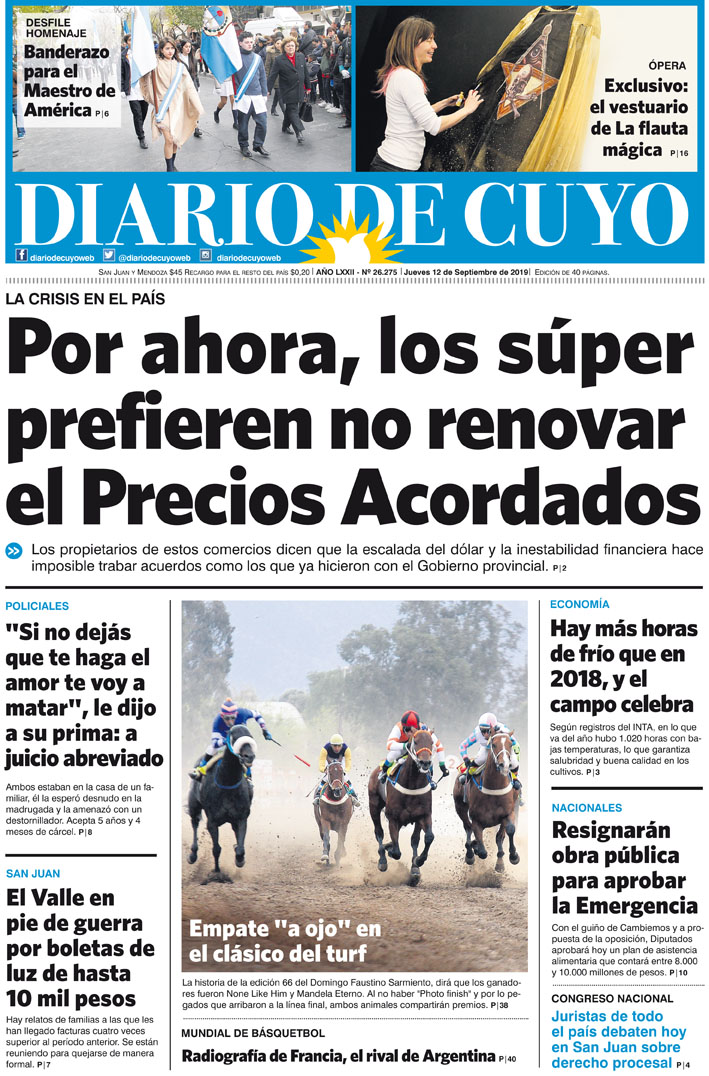 Diario de Cuyo | HOME | Noticias | Tapa Edición Tapa Edición 12 de Septiembre de 2019 Por Redacción Diario de Cuyo 11/09/2019 · 0:00 Escuchar la noticia Escuchar la noticia Your browser doesn’t support HTML5 audio Tapa Edición Ver los comentarios ›