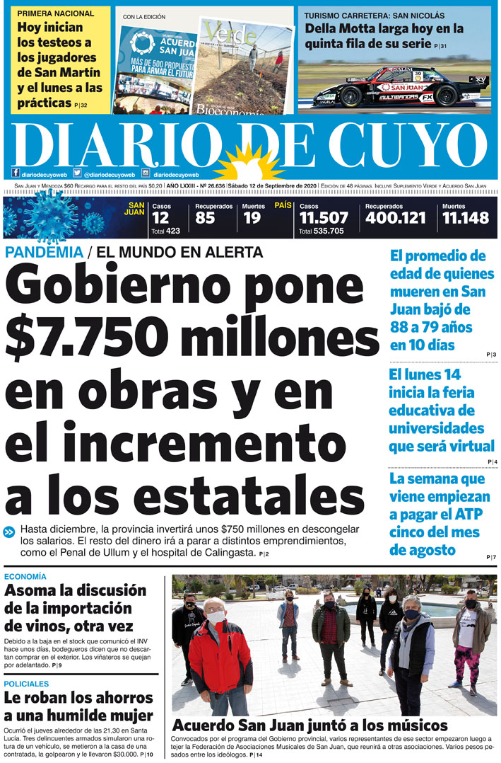Diario de Cuyo | HOME | Noticias Tapa Edición 12 de Septiembre del 2020 Por Redacción Diario de Cuyo 11/09/2020 · 0:00 Escuchar la noticia Escuchar la noticia Your browser doesn’t support HTML5 audio Ver los comentarios ›