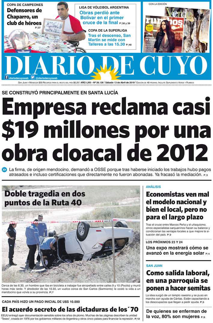 Diario de Cuyo | HOME | Noticias | Tapa Edición Tapa Edición 13 de Abril 2019 Por Redacción Diario de Cuyo 13/04/2019 · 0:00 Escuchar la noticia Escuchar la noticia Your browser doesn’t support HTML5 audio Tapa Edición Ver los comentarios ›