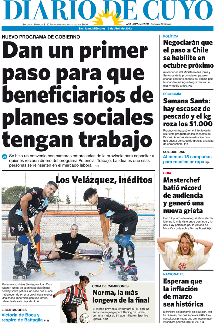 Diario de Cuyo | HOME | Noticias Tapa Edición 13 de Abril del 2022 Por Redacción Diario de Cuyo 12/04/2022 · 0:00 Escuchar la noticia Escuchar la noticia Your browser doesn’t support HTML5 audio Ver los comentarios ›