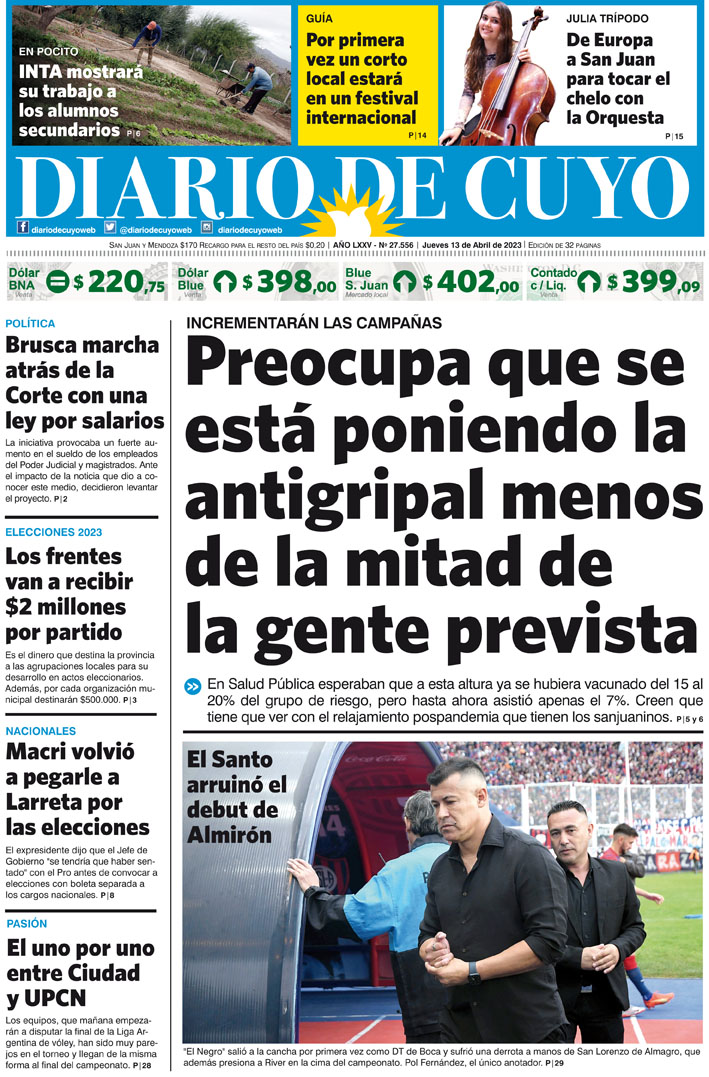 Diario de Cuyo | HOME | Noticias Tapa Edición 13 de Abril del 2023 Por Redacción Diario de Cuyo 12/04/2023 · 0:00 Escuchar la noticia Escuchar la noticia Your browser doesn’t support HTML5 audio Ver los comentarios ›