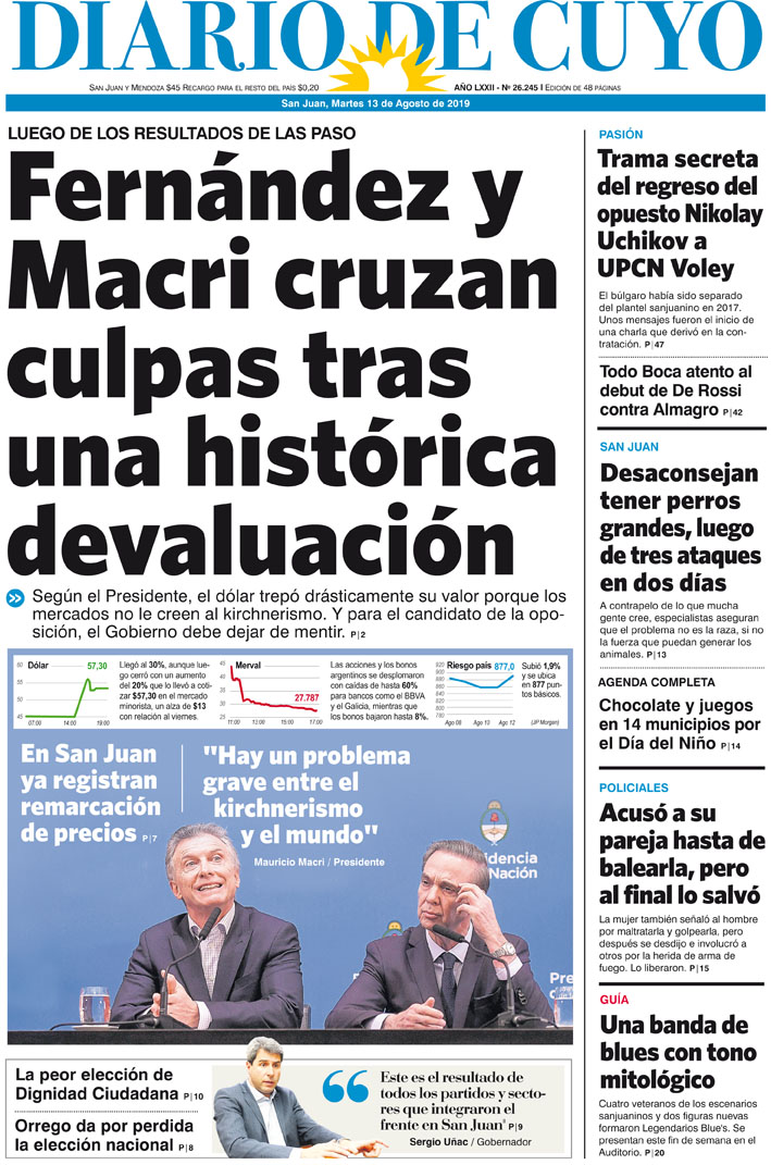 Diario de Cuyo | HOME | Noticias | Tapa Edición Tapa Edición 13 de Agosto 2019 Por Redacción Diario de Cuyo 12/08/2019 · 0:00 Escuchar la noticia Escuchar la noticia Your browser doesn’t support HTML5 audio Tapa Edición Ver los comentarios ›