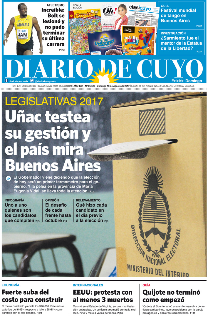 Diario de Cuyo | HOME | Noticias Tapa Edición 13 de Agosto del 2017 Por Redacción Diario de Cuyo 13/08/2017 · 0:00 Escuchar la noticia Escuchar la noticia Your browser doesn’t support HTML5 audio Ver los comentarios ›