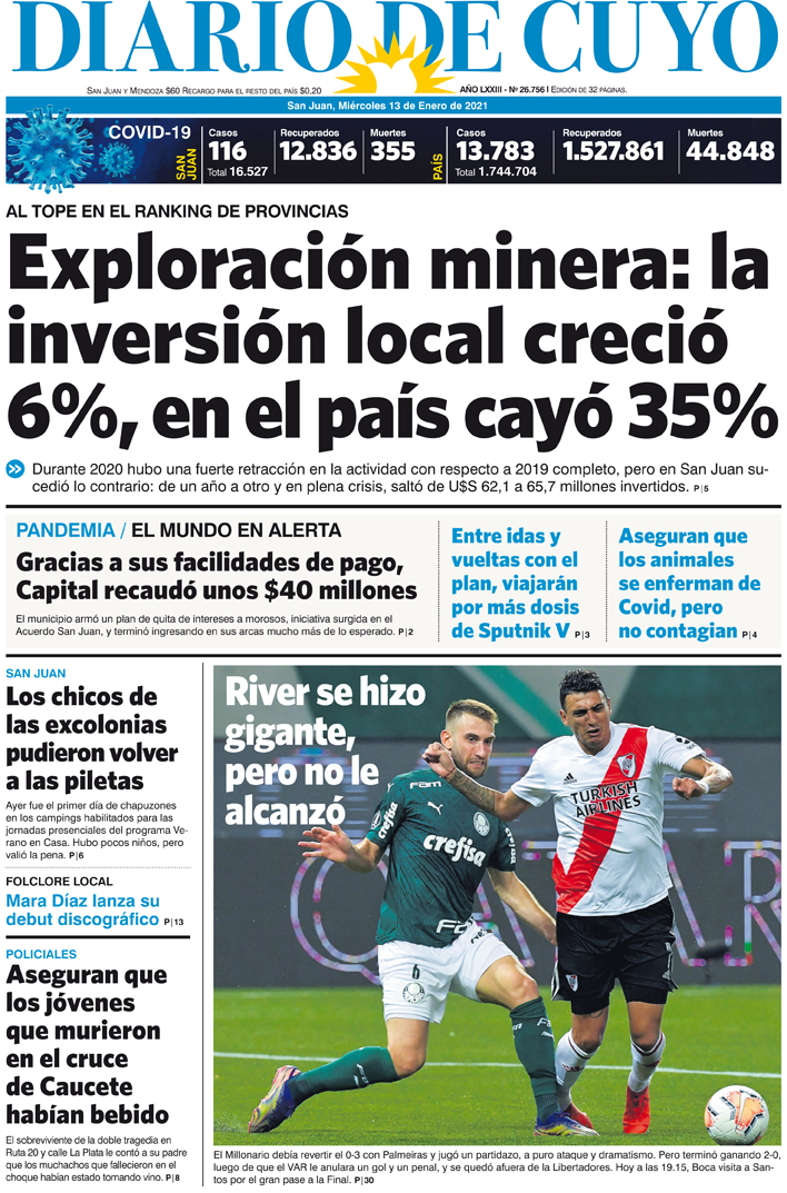 Diario de Cuyo | HOME | Noticias | Tapa Edición Tapa Edición 13 de Enero de 2021 Por Redacción Diario de Cuyo 13/01/2021 · 0:00 Escuchar la noticia Escuchar la noticia Your browser doesn’t support HTML5 audio Tapa Edición Ver los comentarios ›