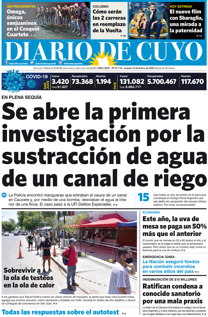 Diario de Cuyo | HOME | Noticias Tapa Edición 13 de Enero del 2022 Por Redacción Diario de Cuyo 12/01/2022 · 0:00 Escuchar la noticia Escuchar la noticia Your browser doesn’t support HTML5 audio Ver los comentarios ›
