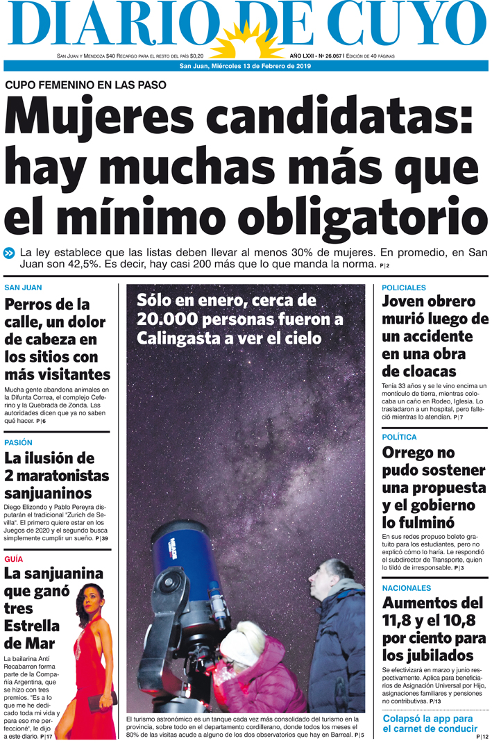 Diario de Cuyo | HOME | Noticias | Tapa Edición Tapa Edición 13 de Febrero 2019 Por Redacción Diario de Cuyo 12/02/2019 · 0:00 Escuchar la noticia Escuchar la noticia Your browser doesn’t support HTML5 audio Tapa Edición Ver los comentarios ›