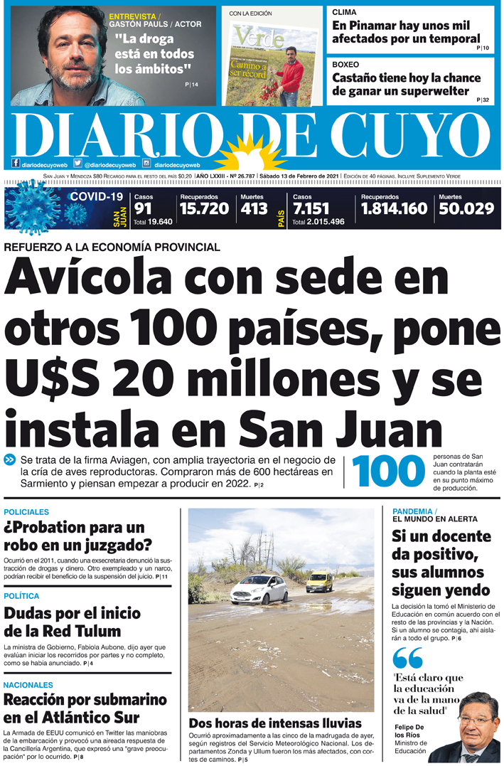 Diario de Cuyo | HOME | Noticias Tapa Edición 13 de Febrero del 2021 Por Redacción Diario de Cuyo 12/02/2021 · 0:00 Escuchar la noticia Escuchar la noticia Your browser doesn’t support HTML5 audio Ver los comentarios ›