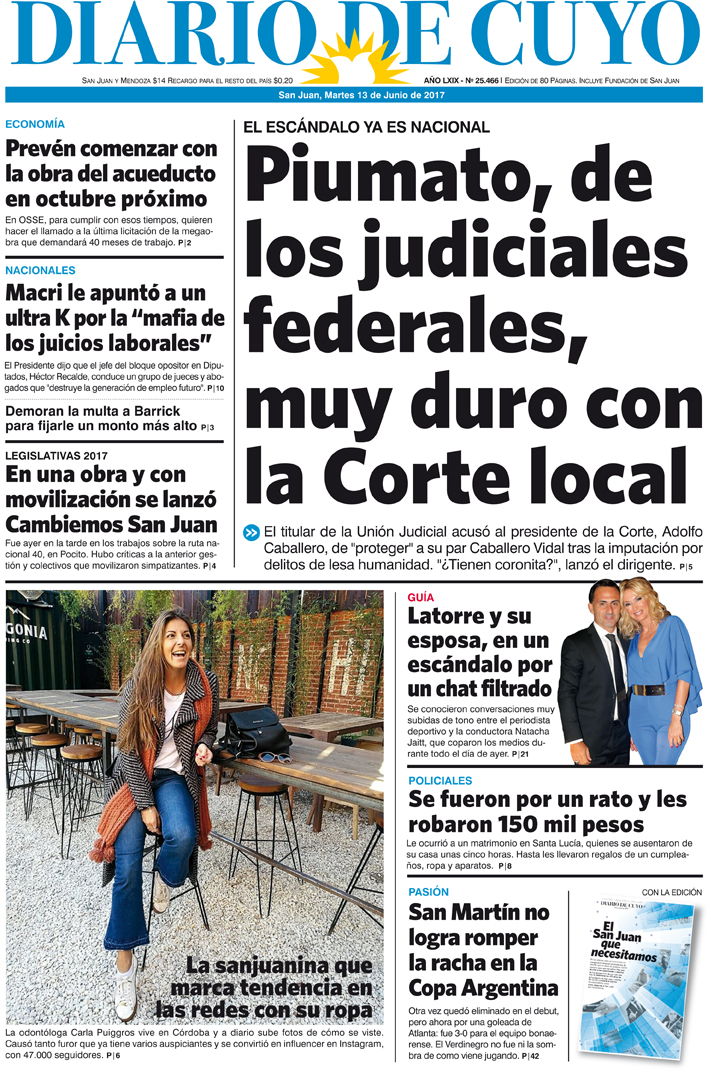 Diario de Cuyo | HOME | Noticias Tapa Edición 13 de Junio de 2017 Por Redacción Diario de Cuyo 12/06/2017 · 0:00 Escuchar la noticia Escuchar la noticia Your browser doesn’t support HTML5 audio Ver los comentarios ›