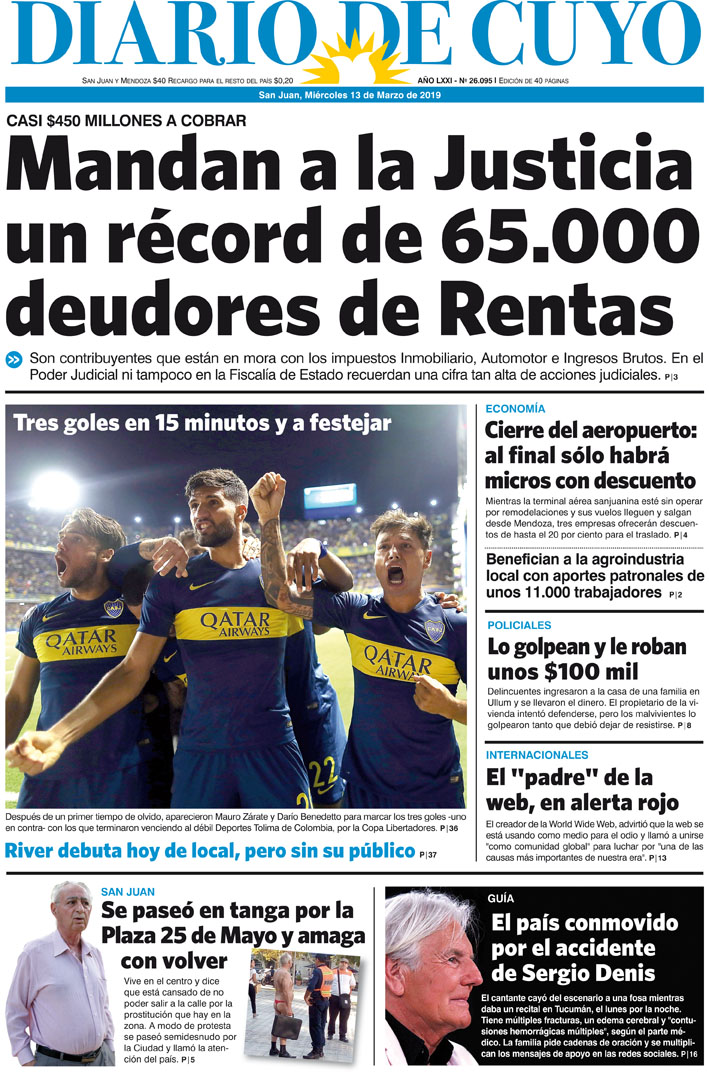 Diario de Cuyo | HOME | Noticias | Tapa Edición Tapa Edición 13 de Marzo 2019 Por Redacción Diario de Cuyo 13/03/2019 · 0:00 Escuchar la noticia Escuchar la noticia Your browser doesn’t support HTML5 audio Tapa Edición Ver los comentarios ›