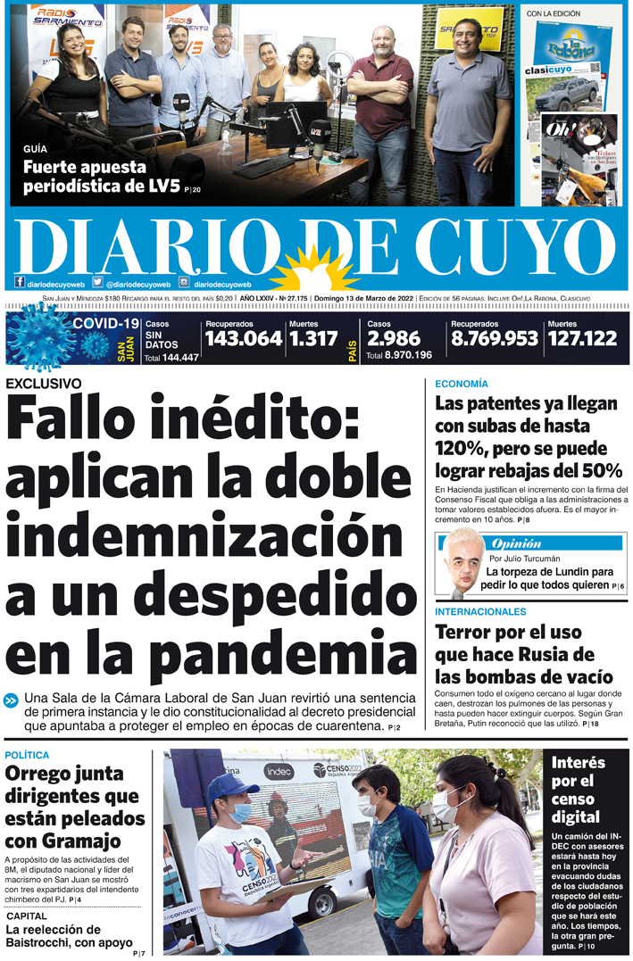 Diario de Cuyo | HOME | Noticias Tapa Edición 13 de Marzo del 2022 Por Redacción Diario de Cuyo 12/03/2022 · 0:00 Escuchar la noticia Escuchar la noticia Your browser doesn’t support HTML5 audio Ver los comentarios ›