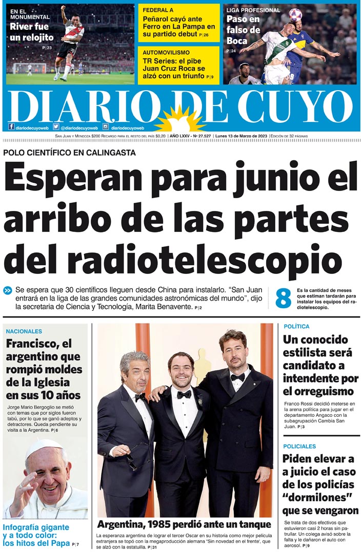 Diario de Cuyo | HOME | Noticias Tapa Edición 13 de Marzo del 2023 Por Redacción Diario de Cuyo 13/03/2023 · 0:00 Escuchar la noticia Escuchar la noticia Your browser doesn’t support HTML5 audio Ver los comentarios ›