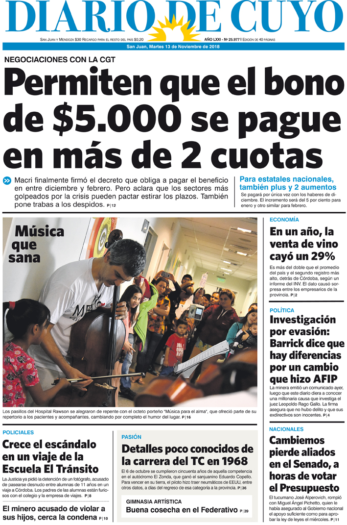 Diario de Cuyo | HOME | Noticias | Tapa Edición Tapa Edición 13 de Noviembre 2018 Por Redacción Diario de Cuyo 12/11/2018 · 0:00 Escuchar la noticia Escuchar la noticia Your browser doesn’t support HTML5 audio Tapa Edición Ver los comentarios ›