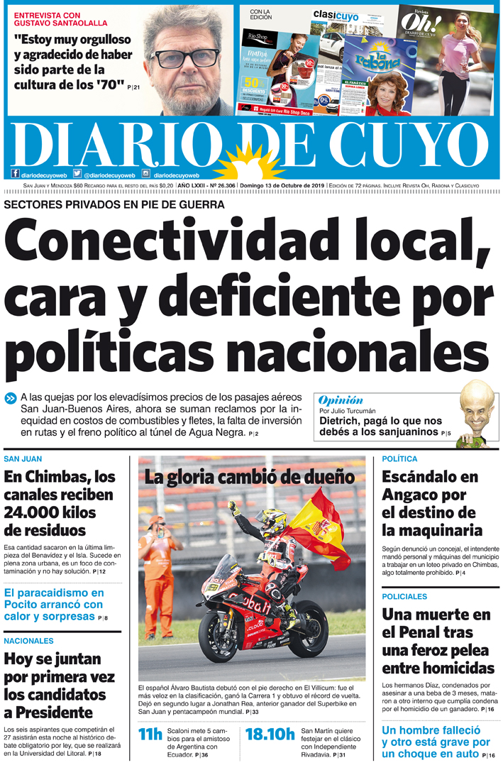 Diario de Cuyo | HOME | Noticias | Tapa Edición Tapa Edición 13 de Octubre de 2019 Por Redacción Diario de Cuyo 12/10/2019 · 0:00 Escuchar la noticia Escuchar la noticia Your browser doesn’t support HTML5 audio Tapa Edición Ver los comentarios ›