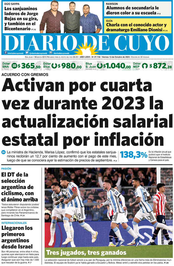 Diario de Cuyo | HOME | Noticias Tapa Edición 13 de Octubre de 2023 Por Redacción Diario de Cuyo 12/10/2023 · 0:00 Escuchar la noticia Escuchar la noticia Your browser doesn’t support HTML5 audio Ver los comentarios ›
