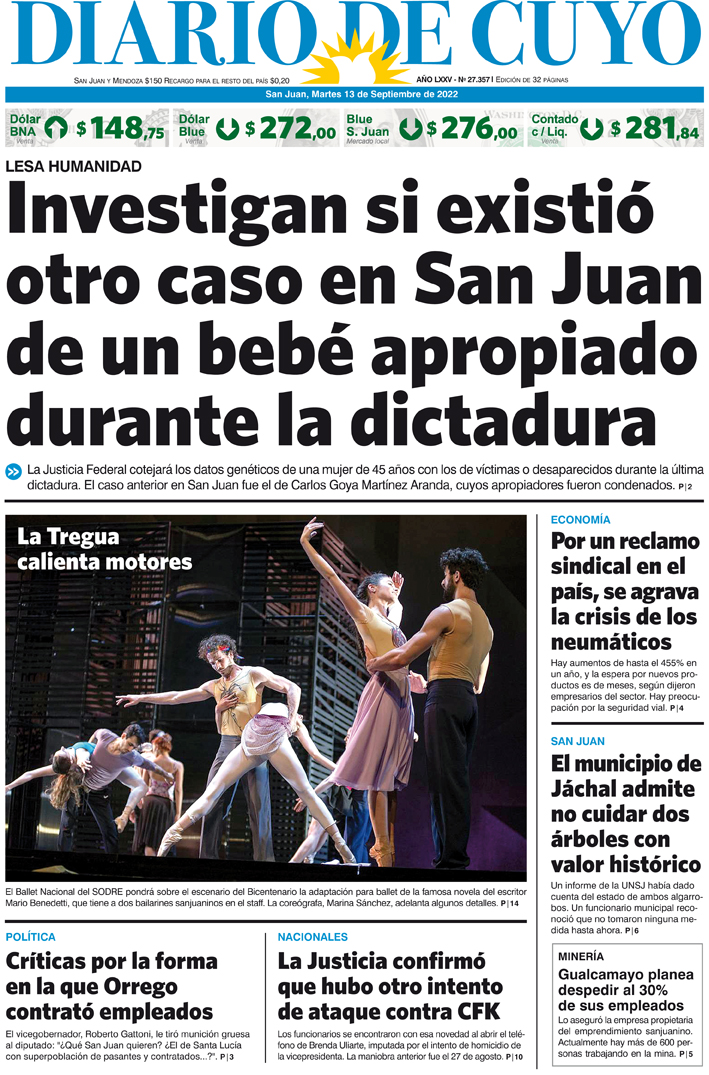 Diario de Cuyo | HOME | Noticias Tapa Edición 13 de Septiembre de 2022 Por Redacción Diario de Cuyo 12/09/2022 · 0:00 Escuchar la noticia Escuchar la noticia Your browser doesn’t support HTML5 audio Ver los comentarios ›