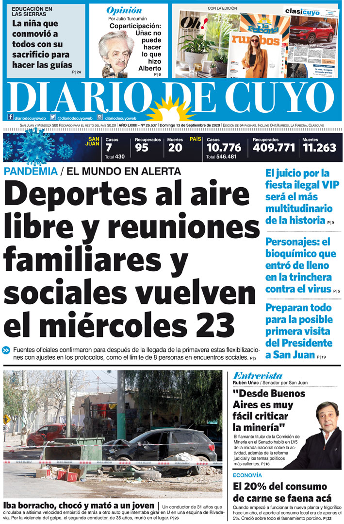 Diario de Cuyo | HOME | Noticias Tapa Edición 13 de Septiembre del 2020 Por Redacción Diario de Cuyo 12/09/2020 · 0:00 Escuchar la noticia Escuchar la noticia Your browser doesn’t support HTML5 audio Ver los comentarios ›